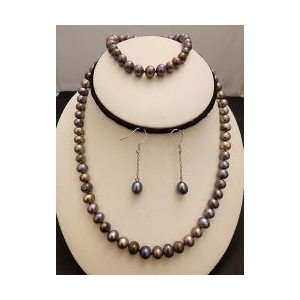 1. Multi-color grey cultured fresh water pearl necklace 7-8MM, it is 18" long with toggle clasp, comes with light grey 7" bracelet and sterling silver single dangle grey pearl earrings. $500.00 ITEX.